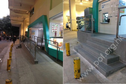 通道由3級梯級及斜道組成;非常寬閣,頂部連接繳費處於牆身有小窗口及有輪椅升降台,底部連接行人路。梯級底部有金屬柱;斜道兩邊設有管狀不銹鋼扶手,無觸覺引路帶。