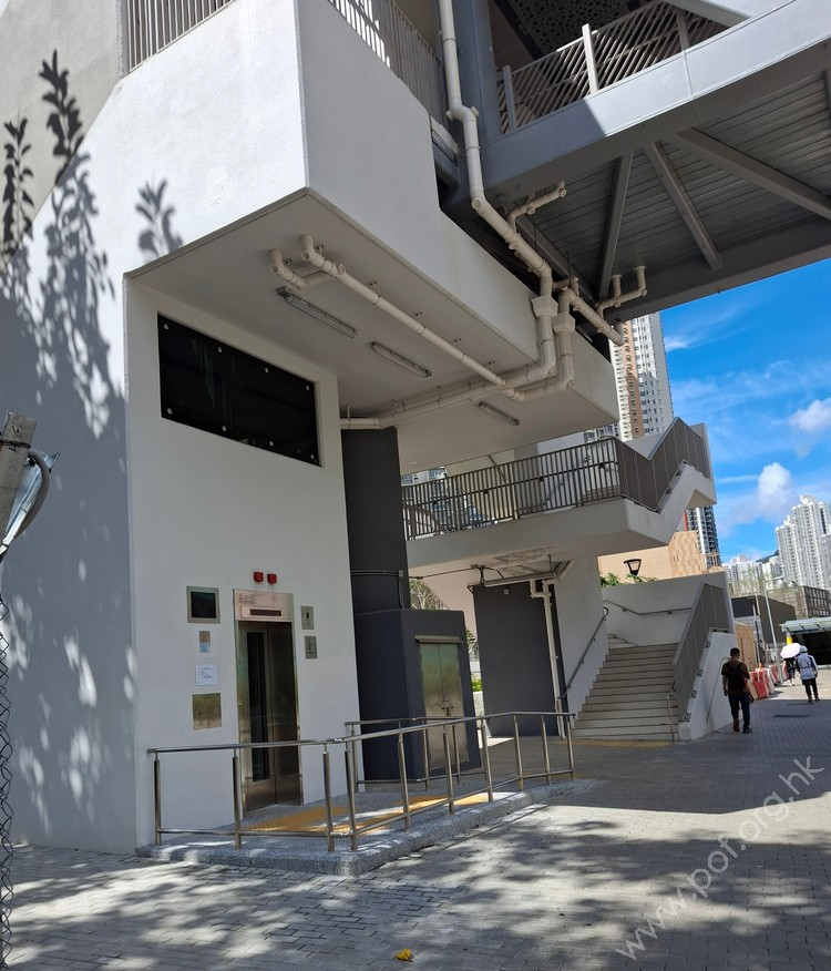 無障礙升降機,連接地面(G)和天橋橋面(F),入口門邊設有國際暢通易達標誌,門的淨闊度足夠800MM,按鈕夠大、設有觸覺點字、凸字資料,星型標誌位於G層按鈕旁邊,廂內有扶手,開、關門有聲、有視像顯示及三種語言廣播。