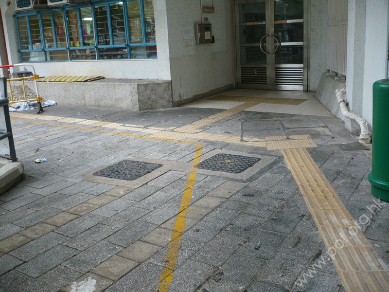 住宅正門閘門前設有黃色觸覺引路帶,沿住宅前的屋邨行人伸延,轉向往商場及住宅伸延。