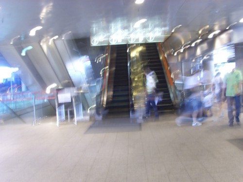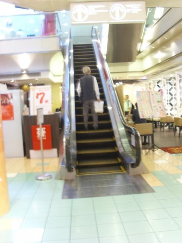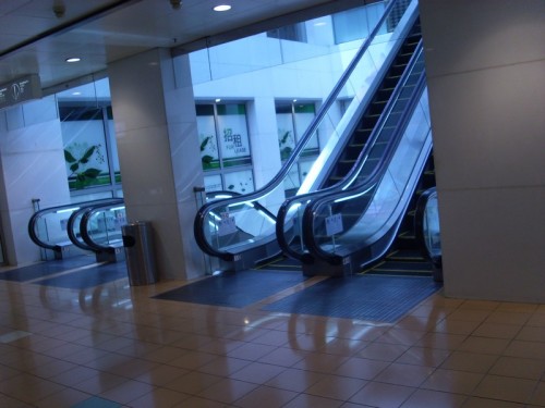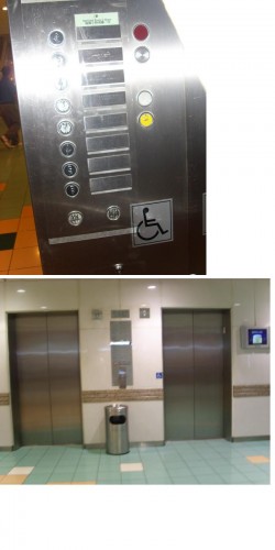 自動電梯分爲左右兩邊,一條上,一條落,電梯很窄,無發聲訊號,底頂無觸覺警告帶.