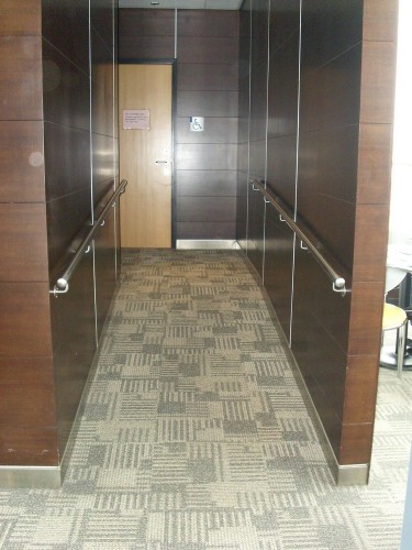 斜道闊足1.05米,角度不大,兩邊有扶手固定於牆上,底頂有平面且鋪有地氈,無觸覺警告帶.牆壁無凸出物.