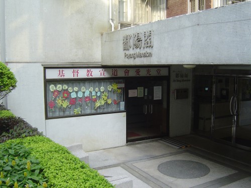 連接屋苑行人路,通道是寬闊的正門,設有一級台階障礙,無斜道輔助,無觸覺引路徑,正門連接鄱陽閣前屋苑露天平台行人路,行人路四周均連接梯級障礙,無斜道輔助,門是玻璃對開推門.