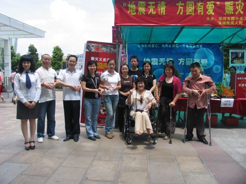 5月24日至25日,正逢周六、周日,街上人流湧動,戶外陽光明媚、風清氣爽、十分宜人,在深圳市華僑城近處的山姆會員店前的廣場上,則呈現出一片熱鬧非凡的景象,一個特殊的義賣群體吸引住了來來往往的市民圍觀。此時,在這裏深圳方圓中天工藝品有限公司與深圳山姆會員店、深圳殘疾人網站和福田區殘疾人工作站聯合舉辦的一場名爲“地震無情,方圓有愛”的賑災義賣募捐活動剛剛開始。方圓公司的團隊表演、精彩節目客串,使整個活動現場激情湧動,許多市民踴躍購物積極參與、熱情回應,大家被愛心企業與殘疾人朋友的真誠所打動,紛紛慷慨捐款,許多小朋友也掏出了自己的零花錢。短短的時間就賣出了三萬多元的産品。一位母親說孩子是拿出了一個月的零用錢,買下的二件工藝品,還說要送給災區的小朋友;一位中年男子一下買走了五件工藝品,將厚厚的一把人民幣投入了捐獻箱,還有許多許多的人們停下他們匆匆的腳步,一方有難,八方支援!同一樣的心情,同一樣的愛!眼前出現的許多感人場面讓人銘記難忘。沈甸甸的義賣箱裏,收穫的不僅僅是善款,更是無聲地感動。