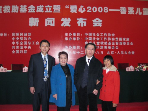 2008年12月28日,中國社會工作協會貧困家庭病殘兒童救助基金成立新聞發佈會在北京人民大會堂舉行。十屆全國人大副委員長何魯麗,原民政部副部長、中國社會工作協會會長徐瑞新等領導出席了發佈會,中國社會工作協會副會長兼秘書長趙蓬奇主持了本次會議。本會顧問(兼會員)丁向群夫婦應邀出席,備受重視並被安排在第一排就座。資料整理:王素琴