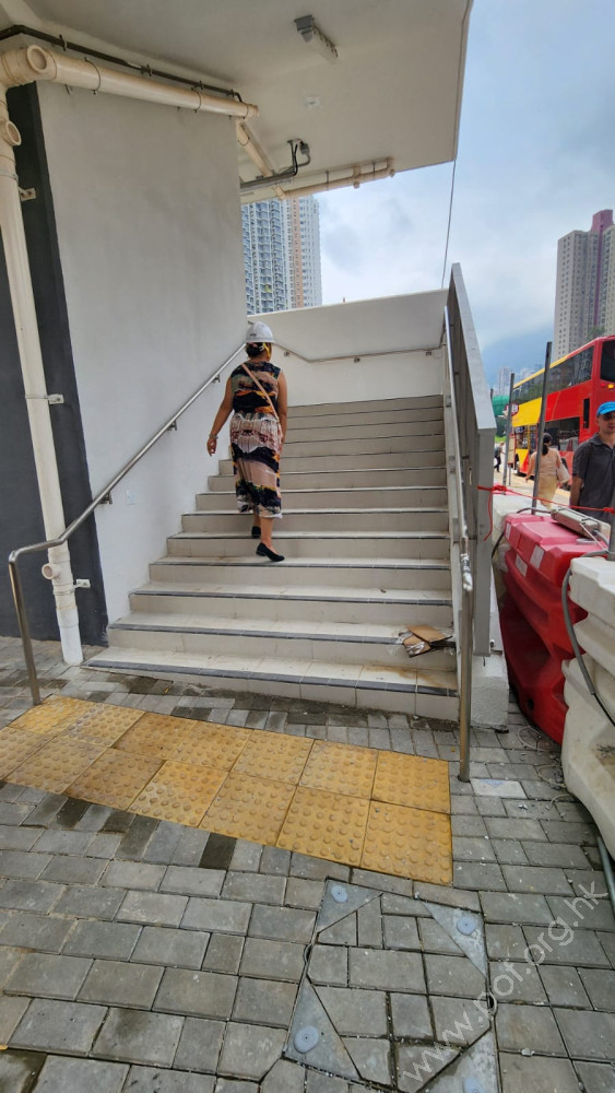 二、天橋出入口梯級旁的扶手上有些觸覺點字牌箭咀和表示樓層的數字安裝方向錯誤,視障人士難以摸讀;