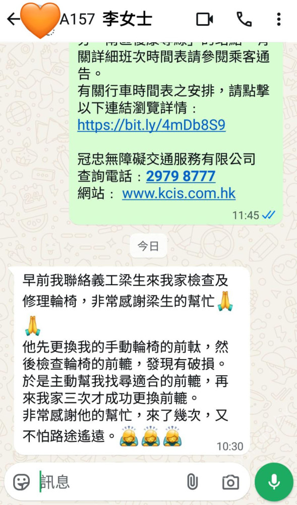 在此,本會再次提供梁師傅手機號碼予大家並請妥善保存,遇到輪椅故障需要檢查或維修,請直接致電或WhatsApp聯絡他:9051 9918