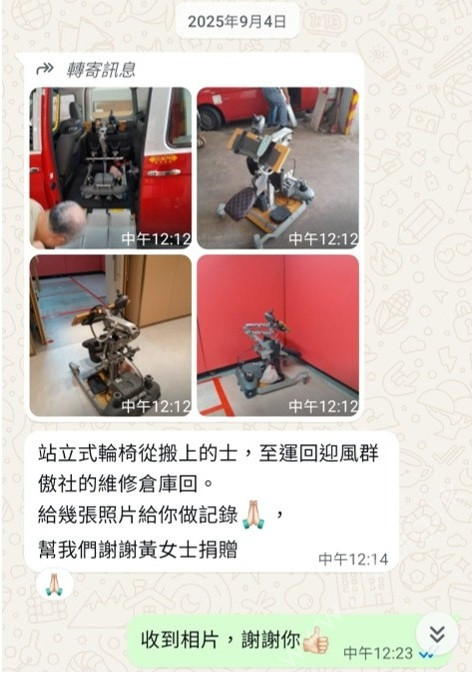 六、會員何靜嫻女士捐贈一部站立式輪椅,受惠單位﹕迎風群傲社(屬肢體傷殘人士的非牟利自助組織)
