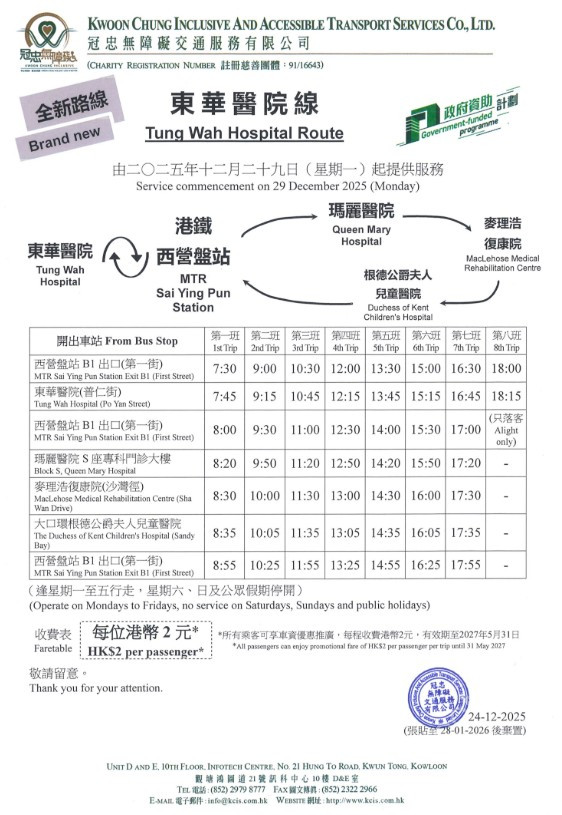 全新路線東華醫院線於2025年12月29日(星期一)起開始提供服務,路線提供至港鐵西營盤站及瑪麗醫院等。 詳情可點擊右方超連結 https://bit.ly/4qp6BDM 冠忠無障礙交通服務有限公司 查詢電話﹕2979 8777 網站﹕ www.kcis.com.hk