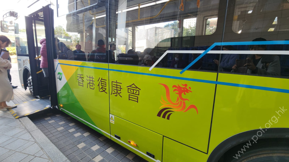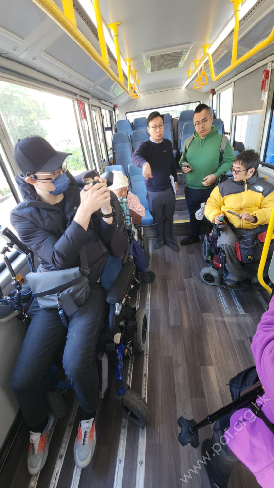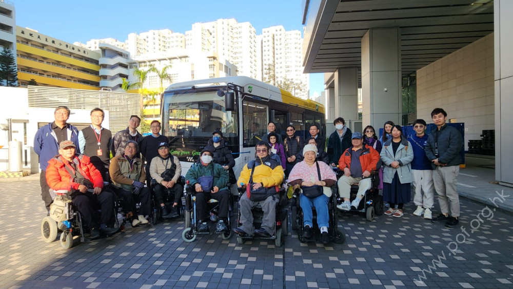 【殘疾人士使用公共交通工具工作小組】各團體代表約30人於西九龍政府合署南座對出露天停車場集合,由香港復康會團隊介紹這款電動復康巴士的設計及邀請參觀者之中的輪椅使用者逐一停泊巴士的3個輪椅座位,並聽取輪椅使用者的意見。