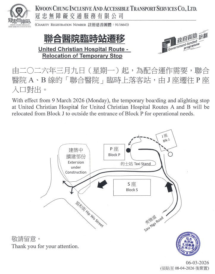 由2026年3月9日(星期一)起,為配合運作需要,聯合醫院A、B線的「聯合醫院」臨時上落客站,由J座遷往P座入口對出。請見頂方附圖。