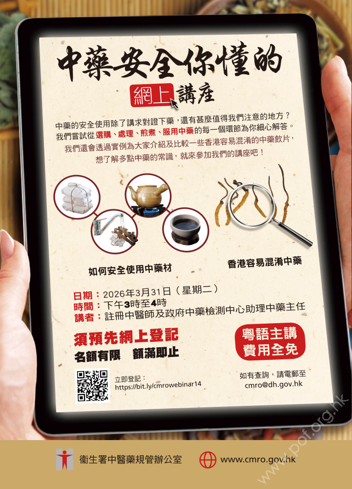 為提高市民對中藥安全的認知,衞生署中醫藥規管辦公室已於2022至2025年舉辦13場「中藥安全你懂的」網上講座。由於反應非常熱烈,網上講座將會在今年3月31日再次舉辦。
