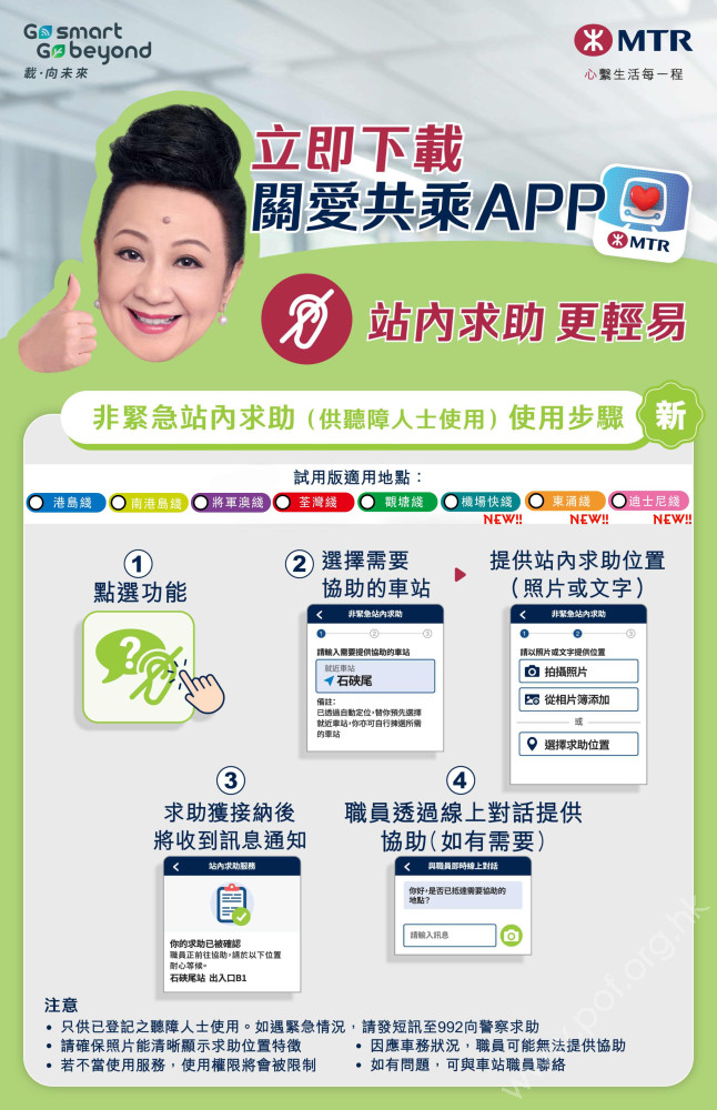 【港鐵資訊】「關愛共乘APP」非緊急站內求助 (供聽障人士使用)再次擴展服務範圍(新)