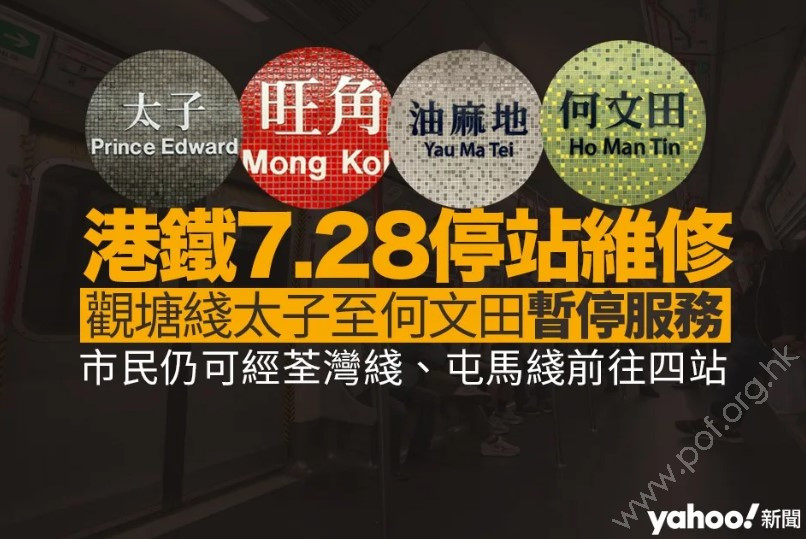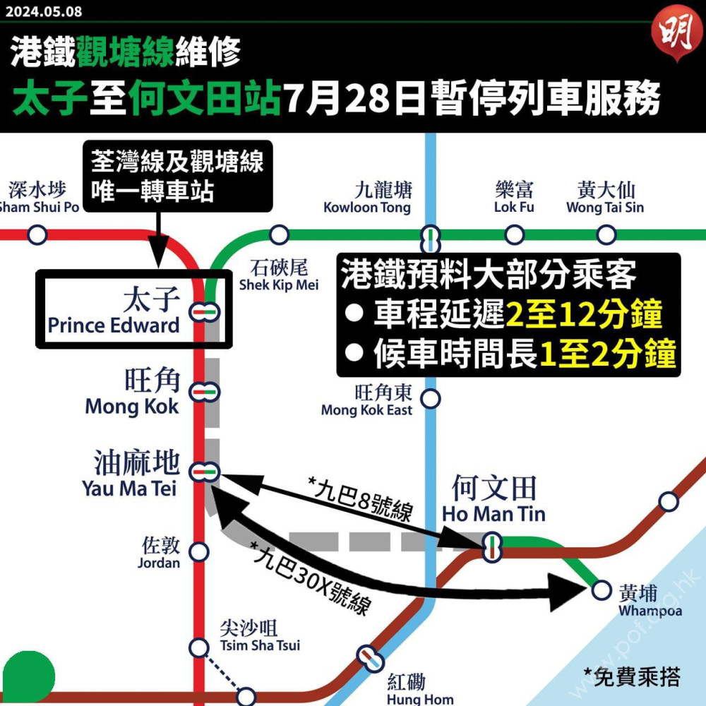 港鐵今日(8 日)宣布,7 月 28 日觀塘綫太子至何文田(太子、旺角、油麻地、何文田) 四個車站會暫停服務一天,以更換電纜吊架。但四個車站於荃灣綫或屯馬綫仍會正常運作,乘客可「兜路」以其他路綫前往該四站。港鐵將與九巴合作,設兩條免費巴士線,來往黃埔及油麻地,及來往油麻地及何文田。