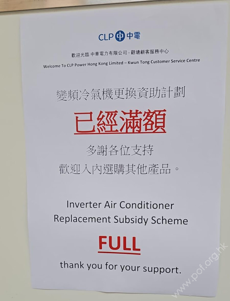 2025年4月14日下午,收到本會會員報料﹕ 上午親臨中電顧客服務中心,見到中電公司張貼告示「變頻冷氣機更換資助計劃已經滿額」。