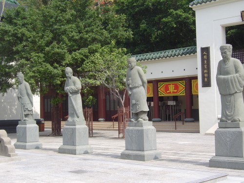 進入正門後,廟宇左邊的走廊上是解簽看相的攤檔,正中是主殿,兩旁建有鐘樓和鼓樓。主殿左首是「鐘樓」,放有一尊巨鐘,鐘上刻著「國泰民安」四字;右首是「鼓樓」,擺著一個大鼓。主殿前是一個大廣場,設有祭台、香爐、聚寶車等,可供善信在露天拜祭。祭台兩旁各設有一排四尊,共八個文臣武將石象,雖是近代的作品,但不失威嚴的氣勢。祭台一角還插有一支過廿呎的車公幡,許多廟宇都沒插有這麼高大的幡呀!