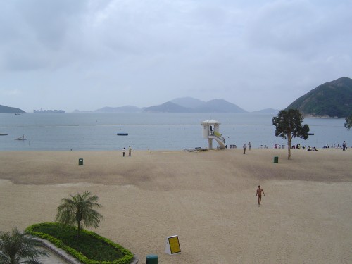 淺水灣的泳灘,寬闊的沙灘,沙粒很是幼細。 | 泳灘遠眺是名為熨波洲的小島。 |